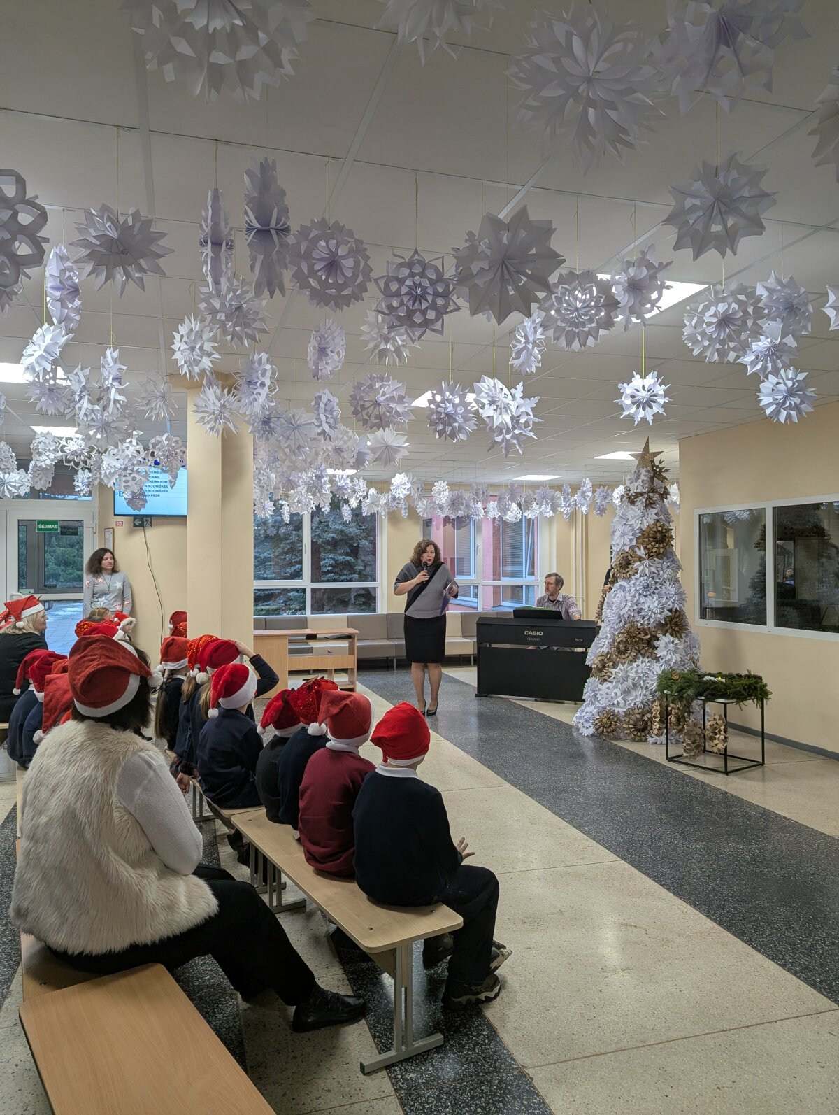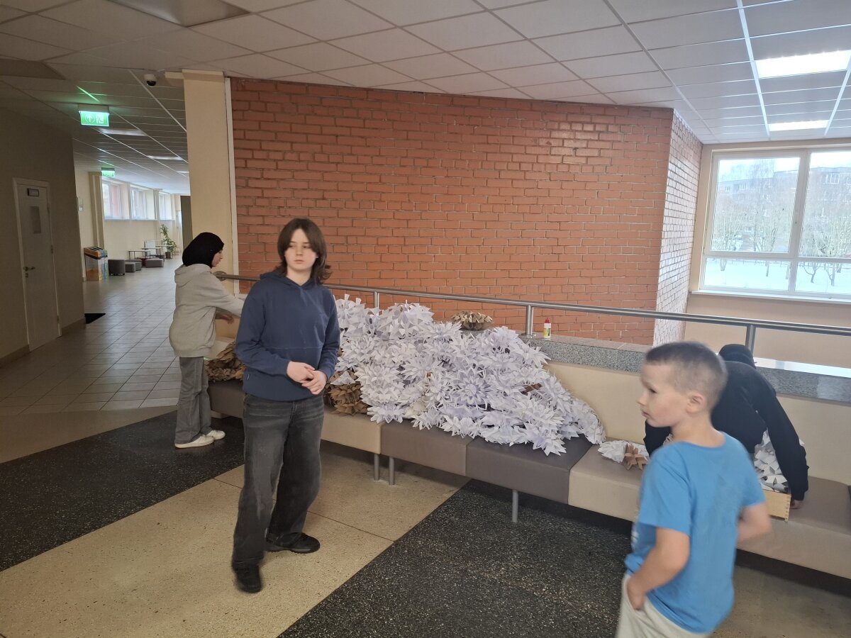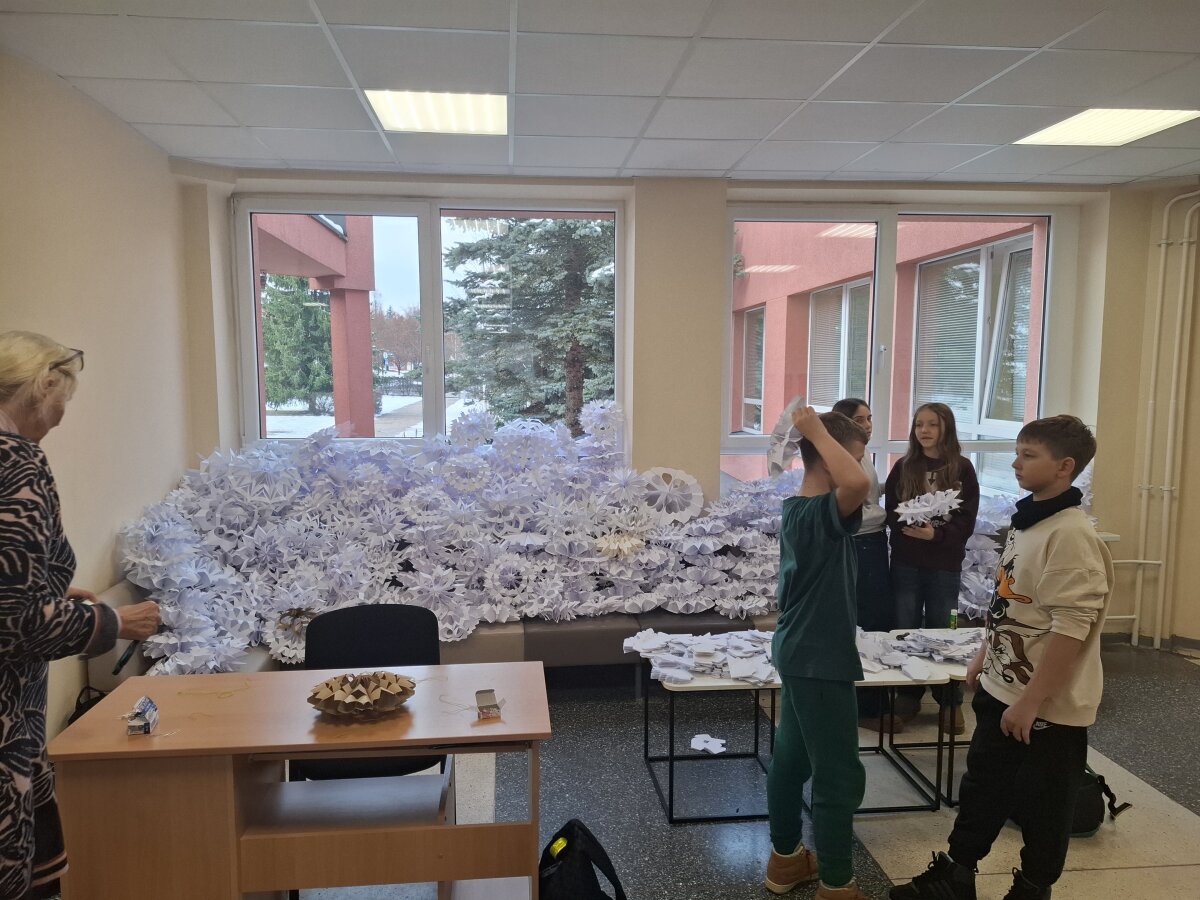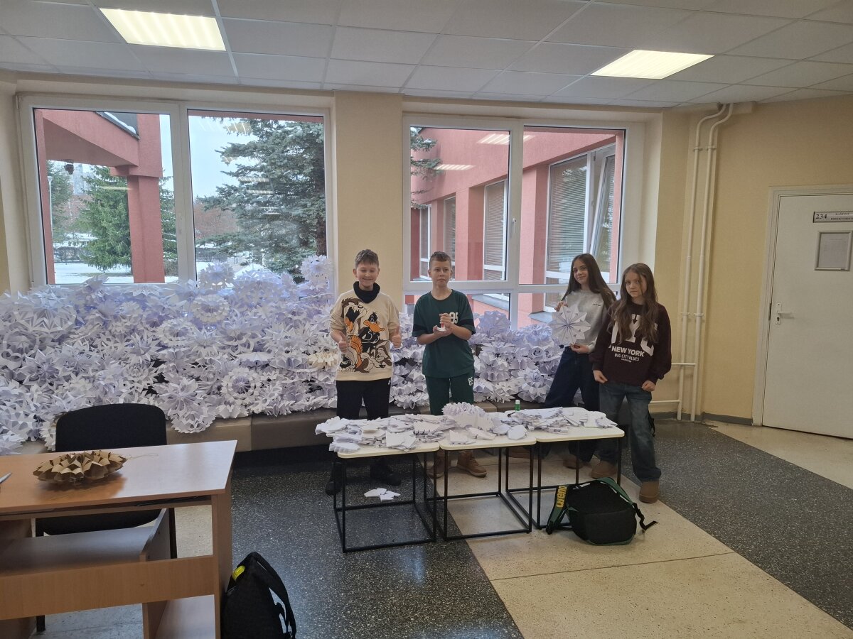 Visą savaitę gamintos snaigės paskutinį lapkričio penktadienį darbščių mokinių ir mokytojų buvo „sutupdytos“ progimnazijoje ir ant eglutės, kurią pagamino progimnazijos darbuotojai Jaroslavas ir Stanislovas.