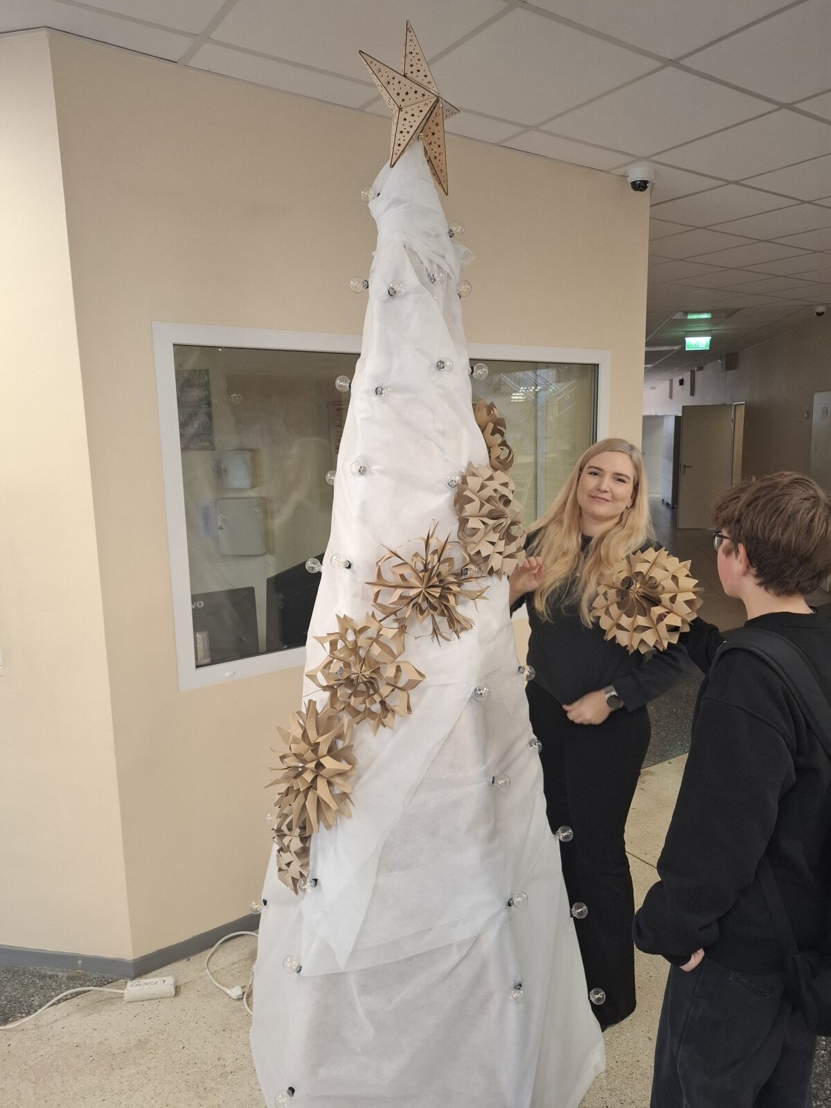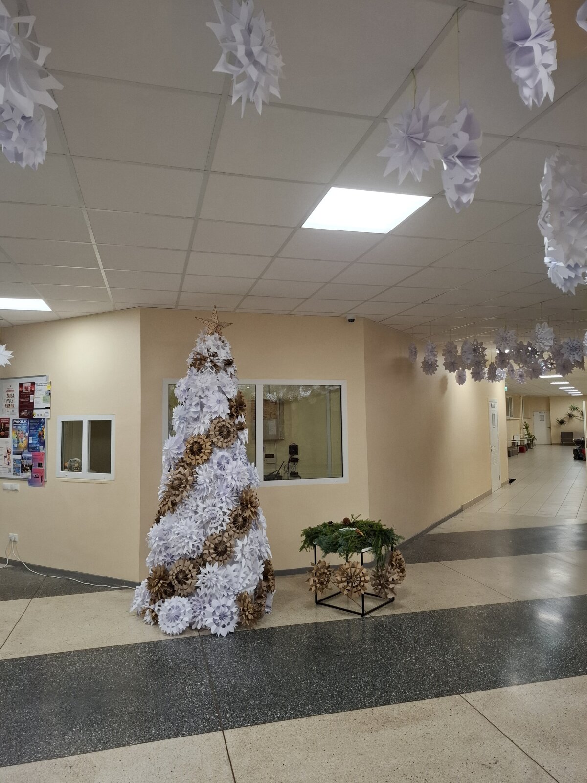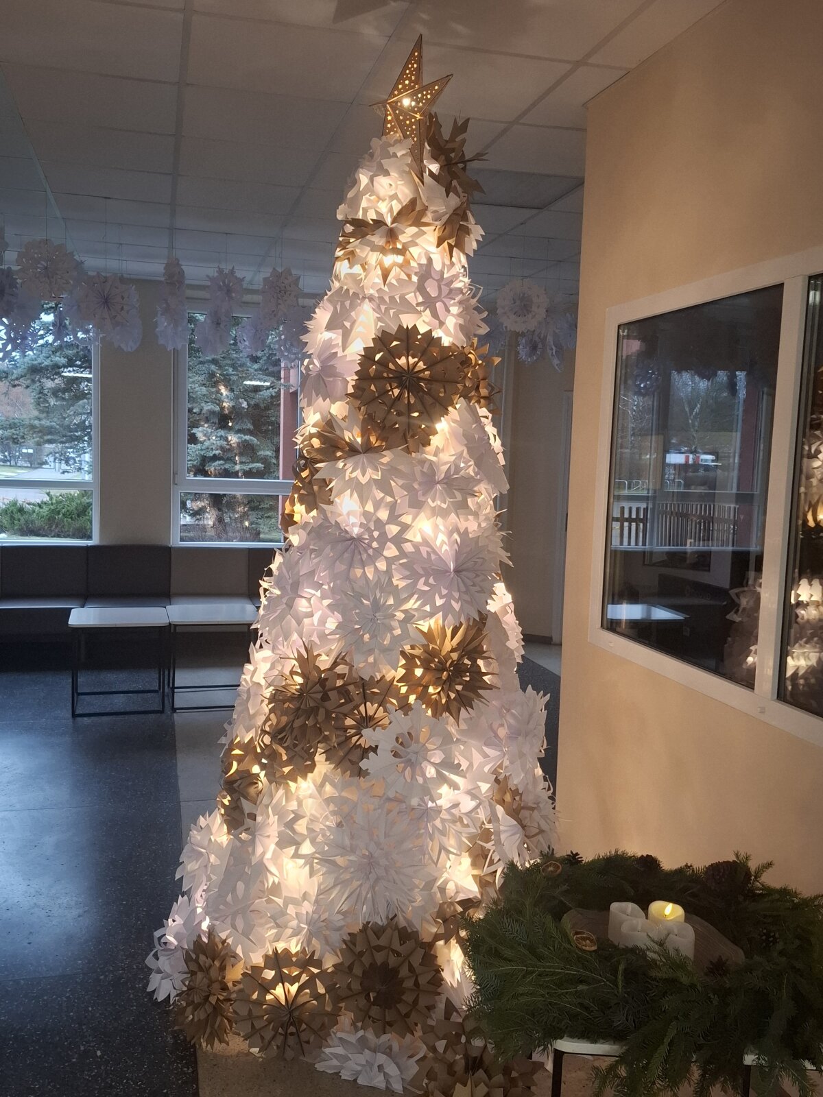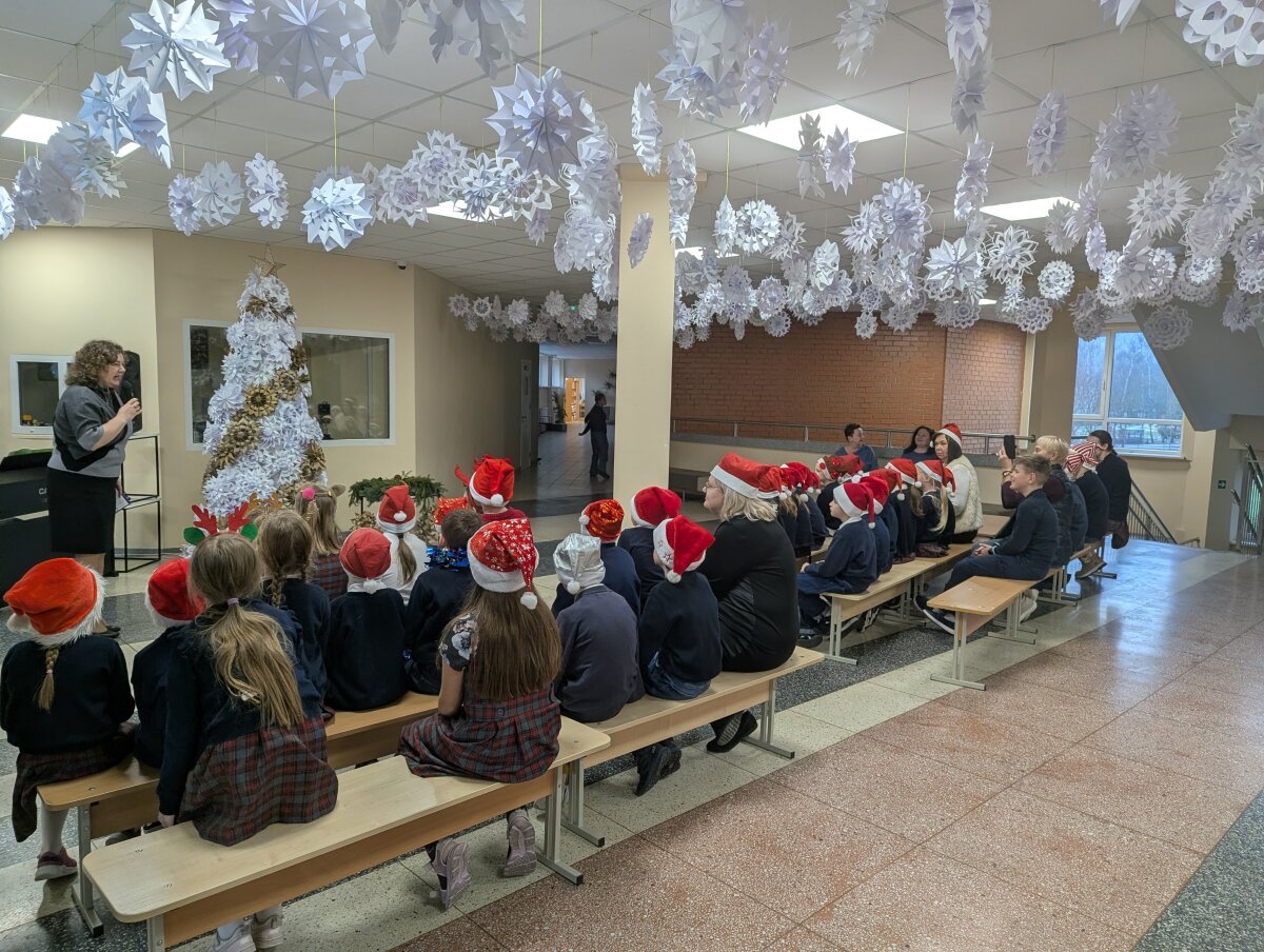 Visą savaitę gamintos snaigės paskutinį lapkričio penktadienį darbščių mokinių ir mokytojų buvo „sutupdytos“ progimnazijoje ir ant eglutės, kurią pagamino progimnazijos darbuotojai Jaroslavas ir Stanislovas.