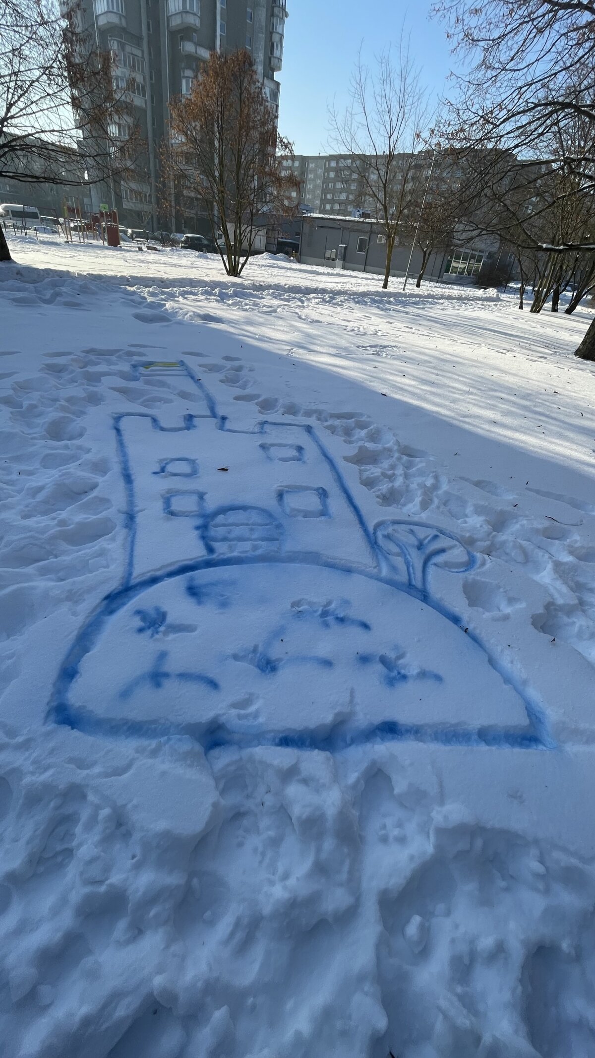 Piešėme su pagaliukais, kiek palinkę, kad nesutryptume savo „šedevrų“. Grupelėmis piešėme atskiras miesto dalis: Gedimino pilį, Katedrą, Trijų kryžių kalną, Baltąjį tiltą ir pan. Nupiešę kontūrus su purškiamais dažais, šiek tiek paspalvinome... Na ir ką? Visai įdomi veikla. Svarbiausia, ne klasėje, o ir laisvės pojūtis realus, ir gamta nuostabi...