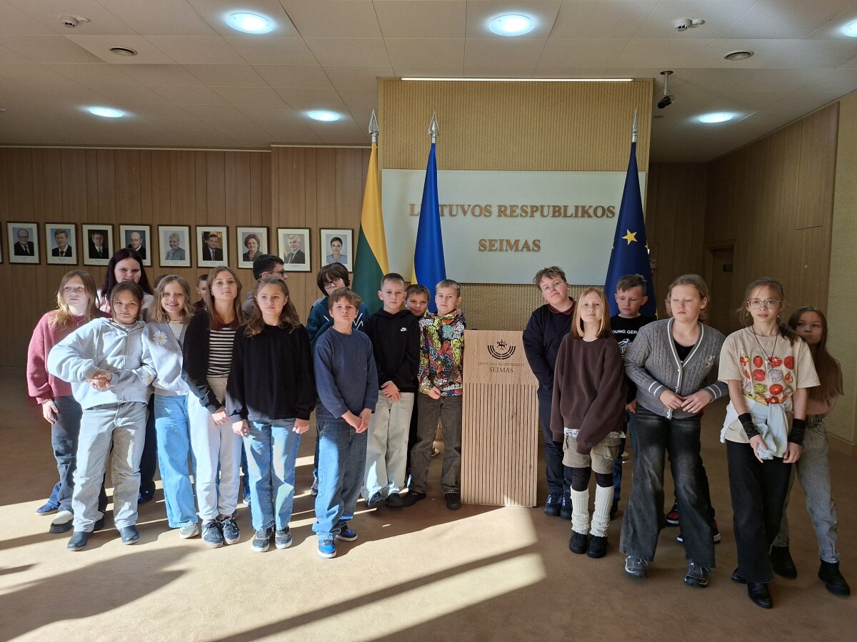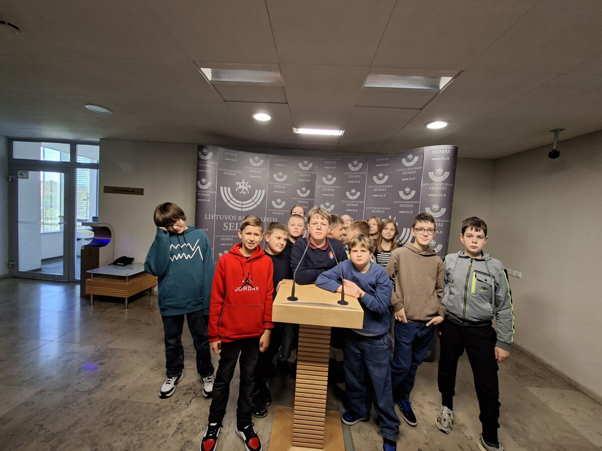 Spalio 20 dieną pamoka mums, 5b klasės mokiniams, vyko ne mokykloje, o Lietuvos Respublikos Seime. Čia susipažinome su parlamento veikla, Seimo narių darbu ir įstatymų leidybos procesu. Vitražo galerijoje, kur stovi daugiau nei 300 tūkstančių trispalvių apyrankių papuošti Gediminaičių stulpai, patys išbandėme parlamentarų darbą. Balsavome už mokslo metų sutrumpinimą ir rekomendacijų dėl mobiliųjų telefonų naudojimosi mokyklose atšaukimą. Buvo taip smagu, jog ne vienas iš mūsų pamąstė, kad užaugę norėtų dirbti Seime.