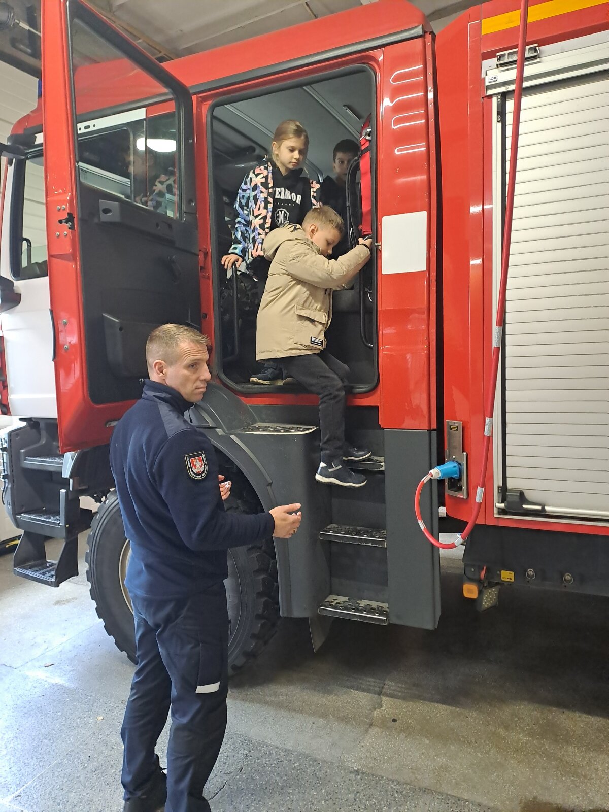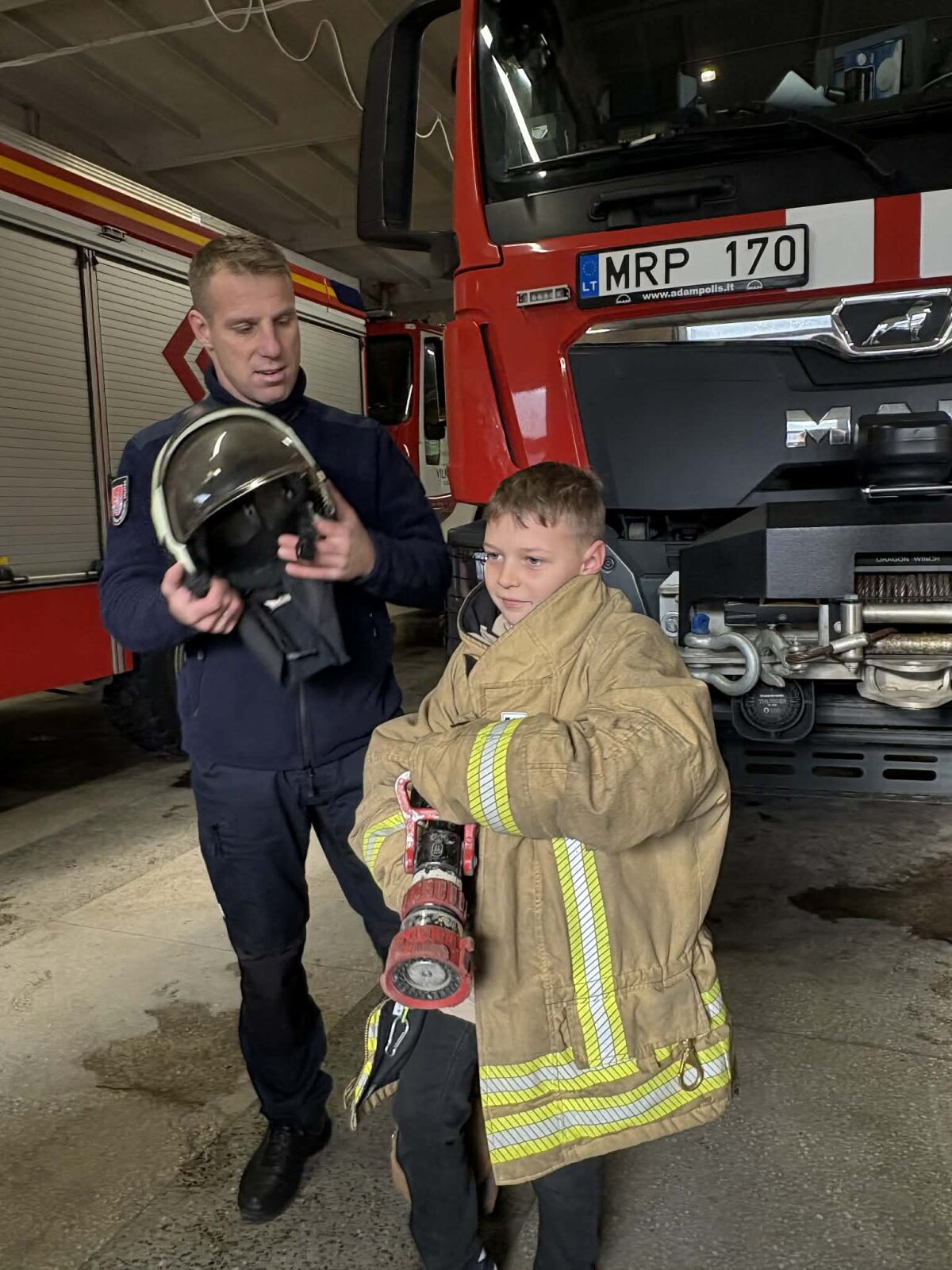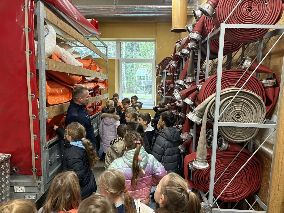 Gaisrinėje mokinius pasitiko budintys ugniagesiai, kurie parodė specialiąją techniką, jos įrangą, ilgas vandens žarnas, specialius drabužius ir apsaugos priemones. Vaikai sužinojo, kaip vyksta atsakingas ugniagesių darbas ir ko reikia, kad taptum tikru gelbėtoju.