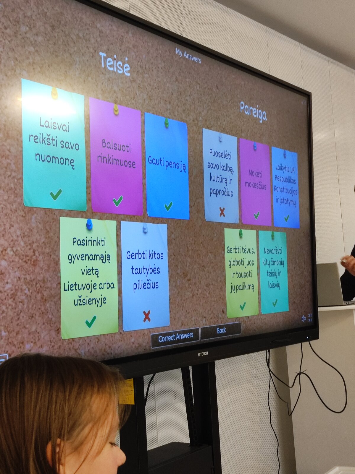 Edukacijos metu mokiniai kūrė komandas, varžėsi žaidimuose ir kartu mokėsi bendradarbiauti ieškant atsakymo - kas yra teisė, o kas pareiga?