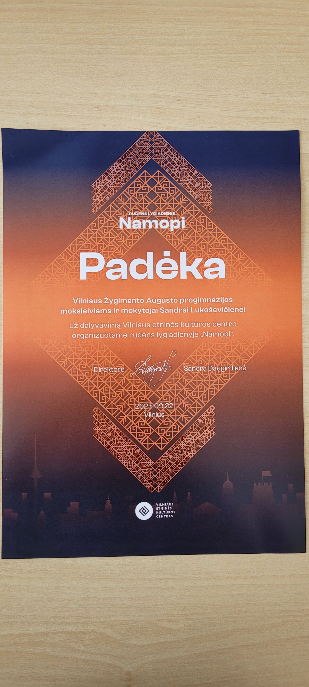 Rugsėjo 22 d. dalis 3a kl. mokinių kartu su tėveliais ir mokytoja Sandra Lokoševičiene dalyvavo Rudens lygiadienio šventėje „Namopi“, kuri vyko Kalnų parke ant Stalo kalno. Renginį organizavo Vilniaus etninės kultūros centras. Mokiniai dėliojo ugnies raštus iš žvakių, stebėjo fakyrų trupės pasirodymą.