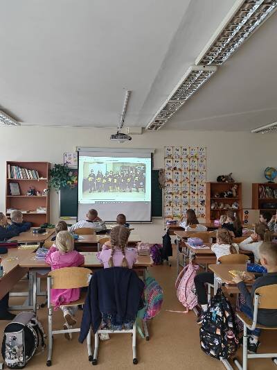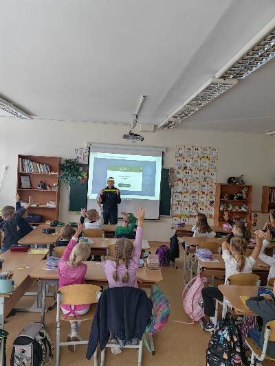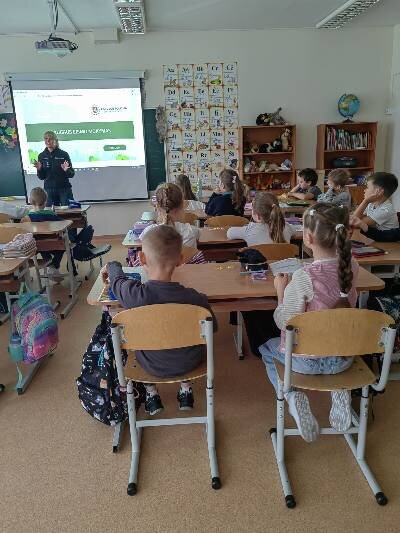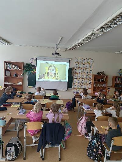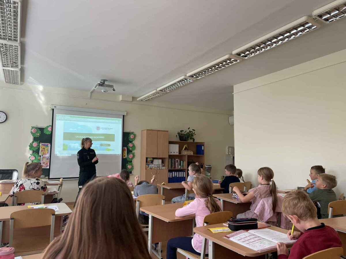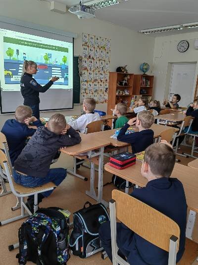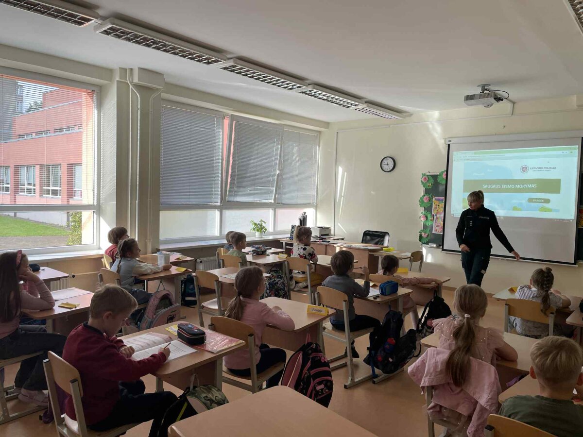 Tad ir mūsų progimnazijos 1a ir 1b klasių mokiniams buvo organizuotos saugaus eismo pamokėlės, kurias vedė ne jų klasės mokytojos, o Vilniaus m. 5-ojo policijos komisariato vyriausioji tyrėja (bendruomenės pareigūnė) Renata Makūnienė. Pirmokai žiūrėjo mokomąjį filmuką, atsakinėjo į klausimus, modeliavo situacijas. Vaikai suvokė, jog saugumas priklauso nuo visų eismo dalyvių ir pamokėlėse įgytas žinias taikys kasdienėse situacijose.