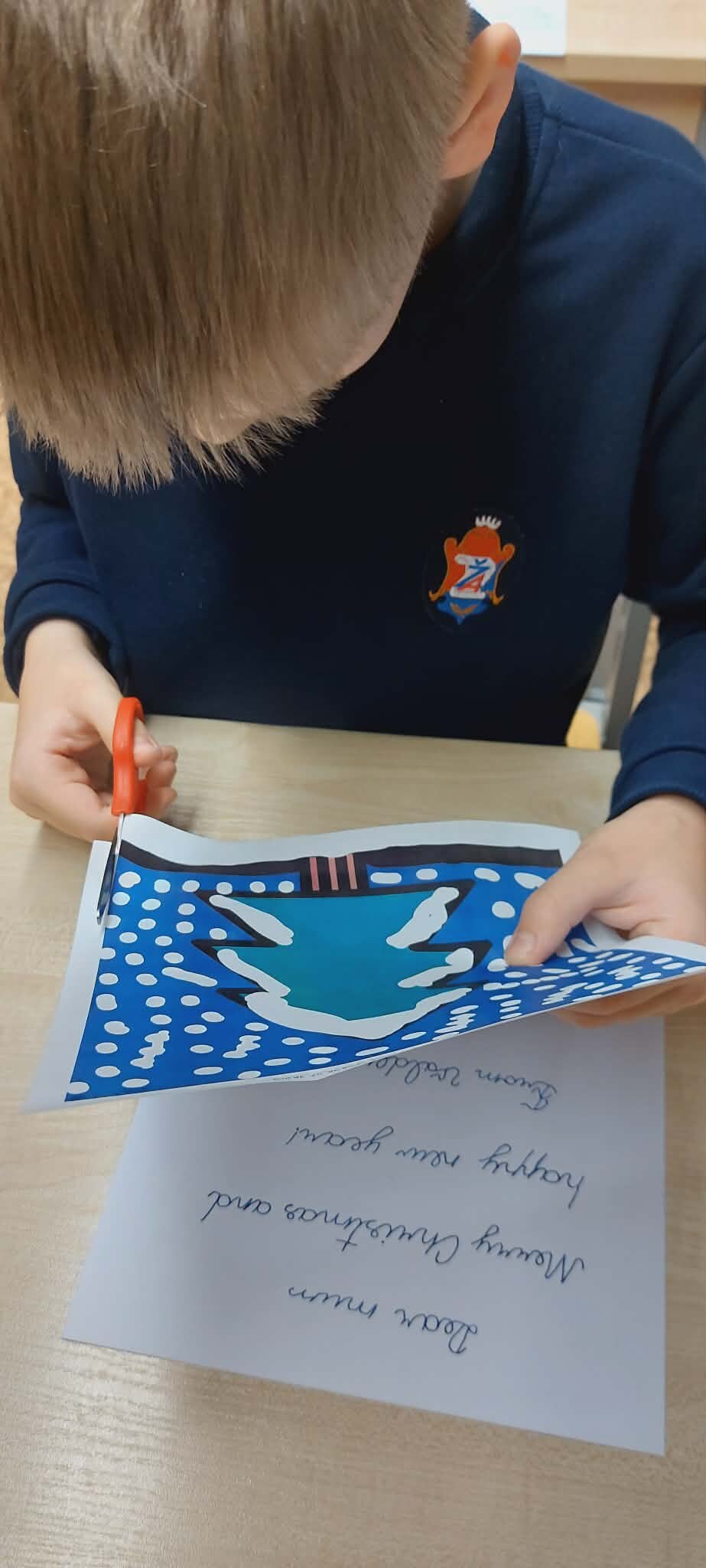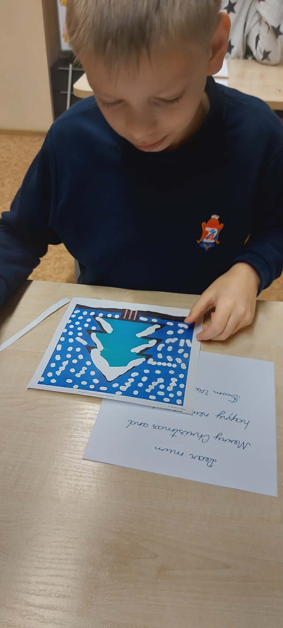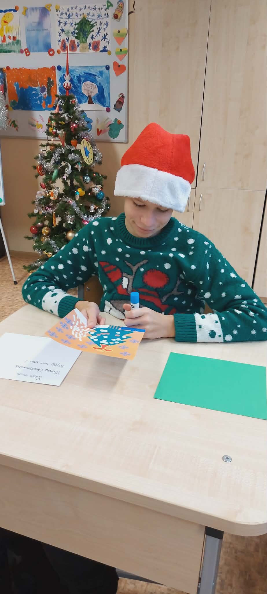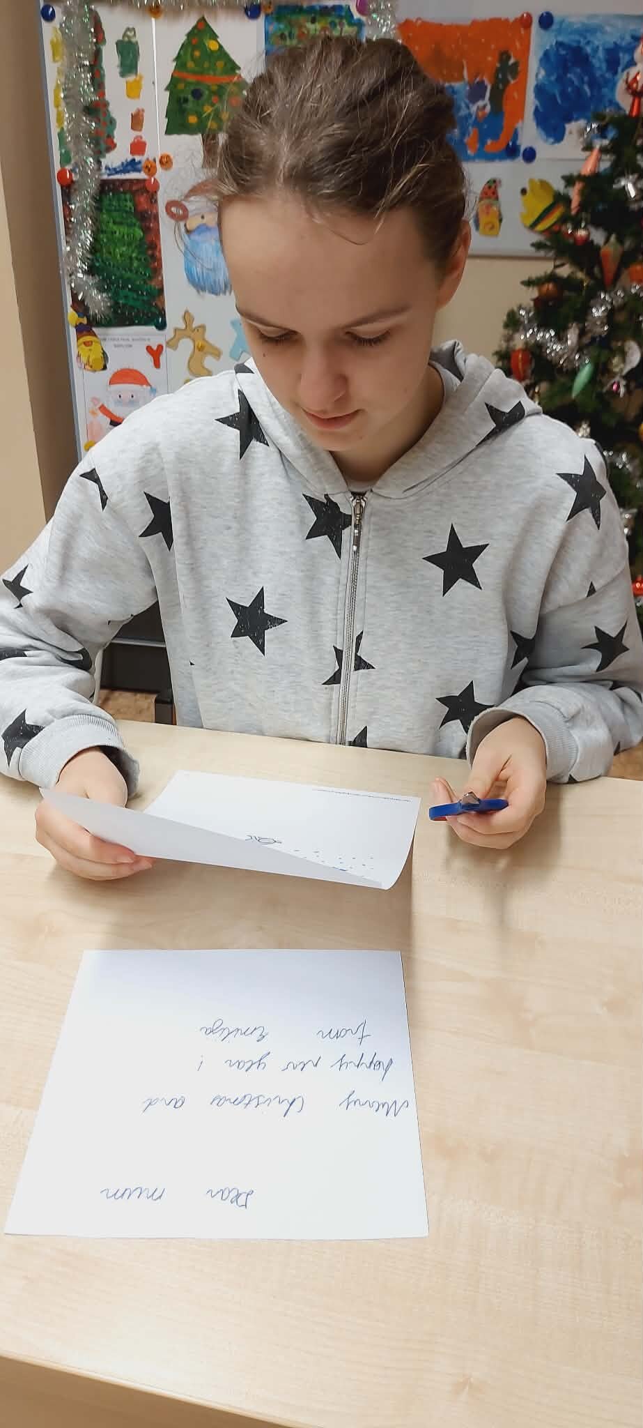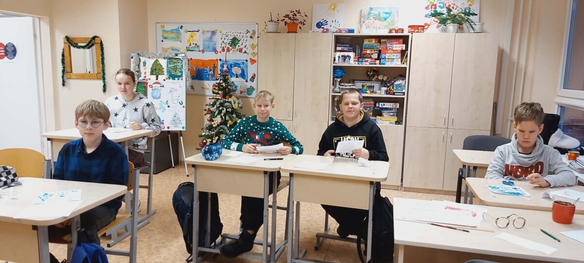 Anglų kalbos pamokose mokiniai mokėsi rašyti trumpus kalėdinius sveikinimus anglų kalba. Jie kartojo jau žinomą leksiką, mokėsi naujų žodžių ir frazių, reikalingų šventiniams palinkėjimams, bei stengėsi pritaikyti juos savo sukurtuose atvirukuose.