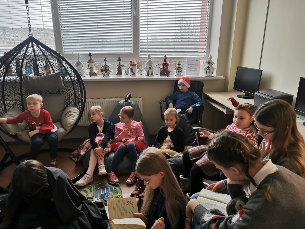 Šia proga į biblioteką atskubėjo 5 klasės skaitovai, mokomi Jorūnės Didžgalvienės, kurie mažiesiems klausytojams paskaitė teatralizuotąją Toves Jansson apysaką „Eglutė“. Ar žinote, kad iš žiemos miego pabudę troliai nežino kas yra Kalėdos? Jie šiek tiek Kalėdų prisibijojo. Nors ir nežinodami, Mumiai labai labai stropiai ruošėsi ir šventė atėjo pas juos.
