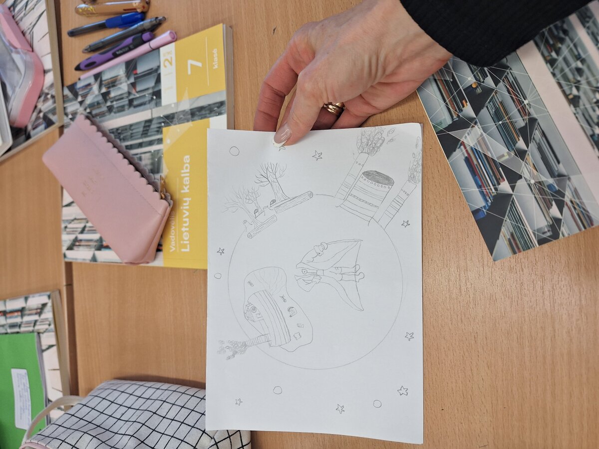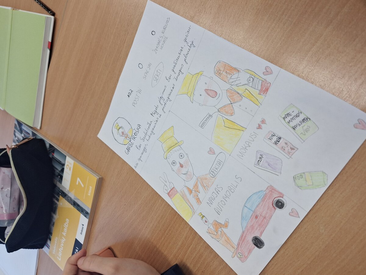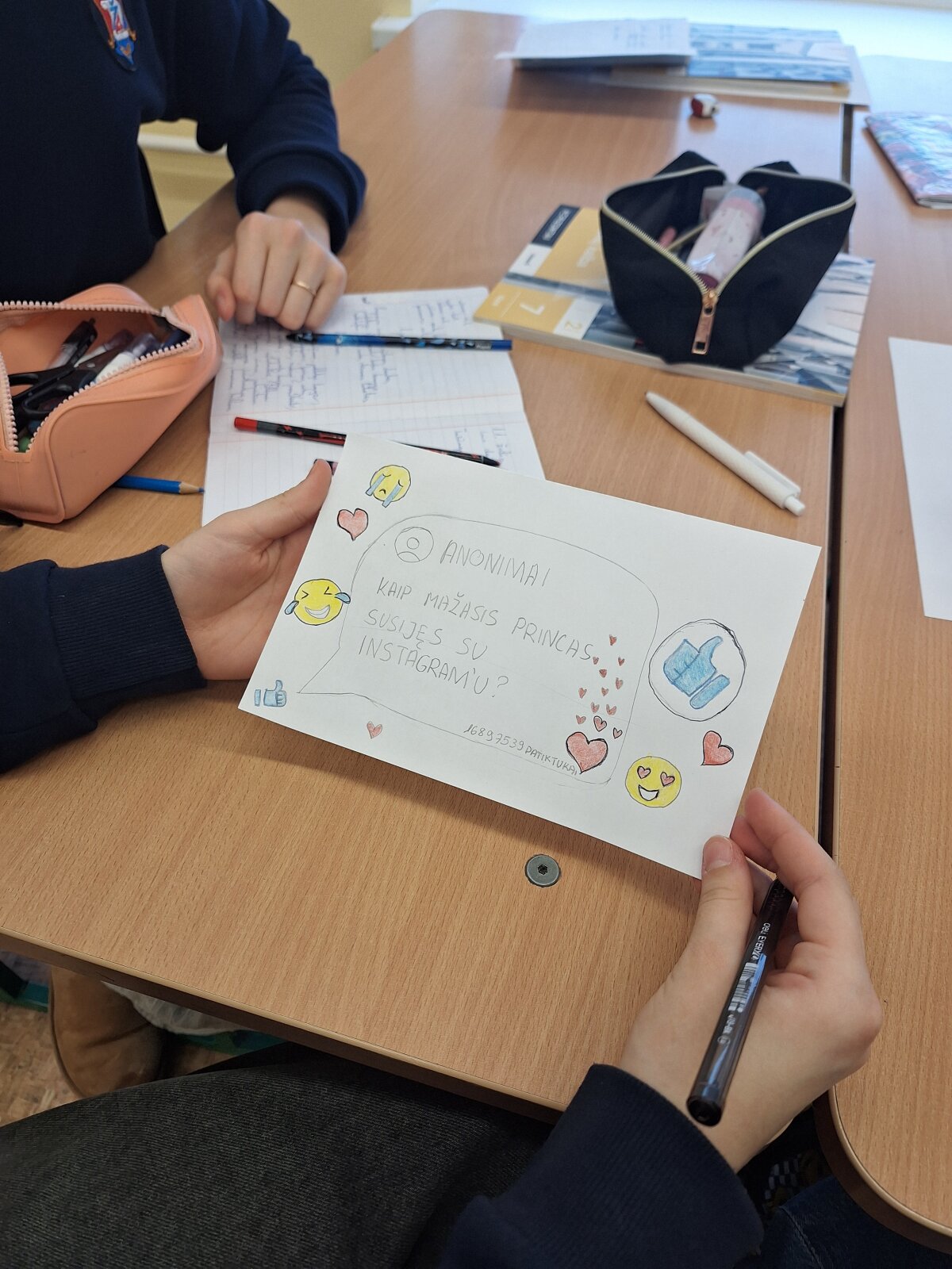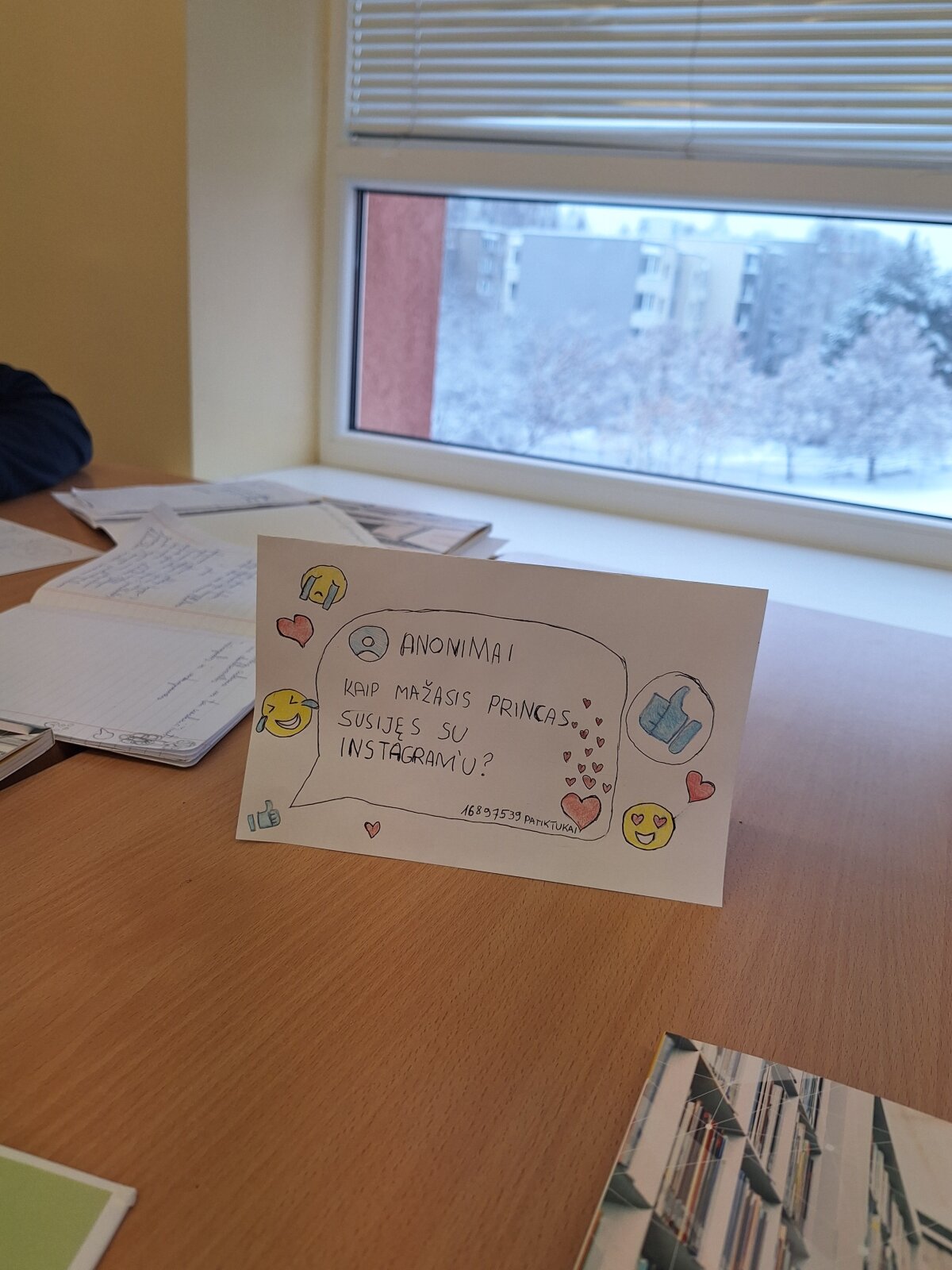 2-os grupės mokinių tema: „Tuščiagarbio ir Mažojo princo „instagram'as" popieriaus lape" (Socialiniai tinklai: išorinis blizgesys, nuomonės formuotojai, „like" kultūra, filtrai). Mokiniai sukūrė Tuščiagarbio ir Mažojo princo „instagram'o" profilius popieriaus lape, juos palygino ir aptarė išorinio blizgesio ir vidinės vertės skirtumus.