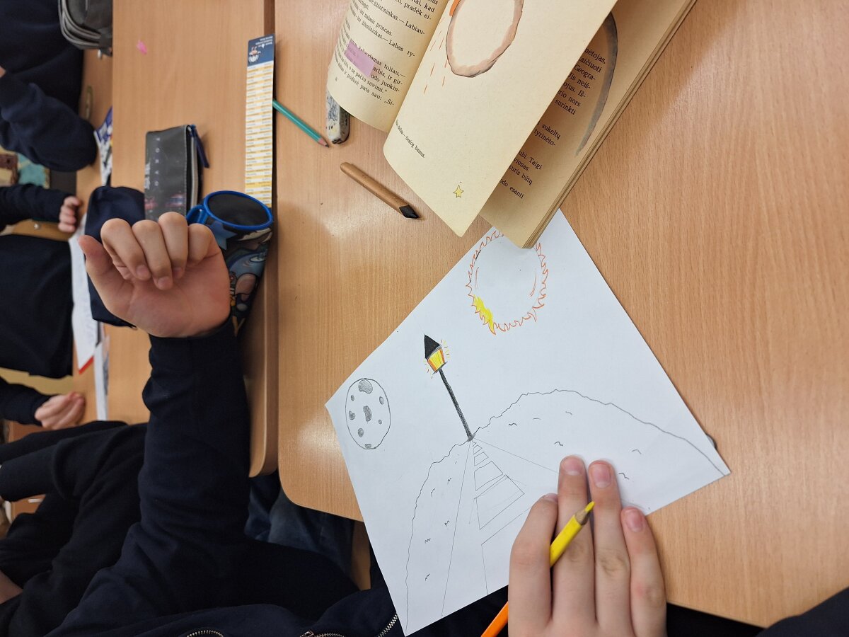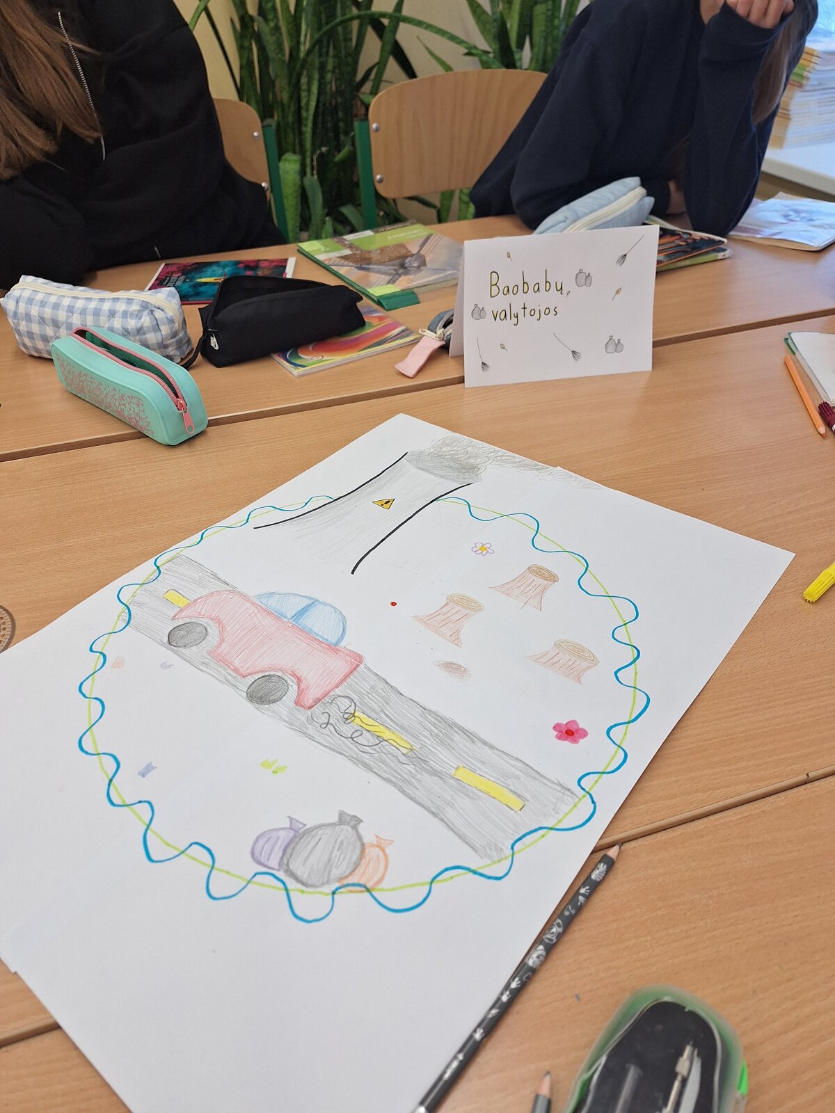 1-os grupės mokinių tema: „Baobabai mūsų planetoje" (Ekologija ir atsakomybė: klimato kaita, tarša, plastikas...). Mokiniai nupiešė savo mažąją planetą ir pavaizdavo šių dienų „baobabus": šiukšles, smogą, miškų kirtimą, taip pat siūlė kasdienius „ravėjimo" darbus - rūšiavimą, taupymą, valymą.