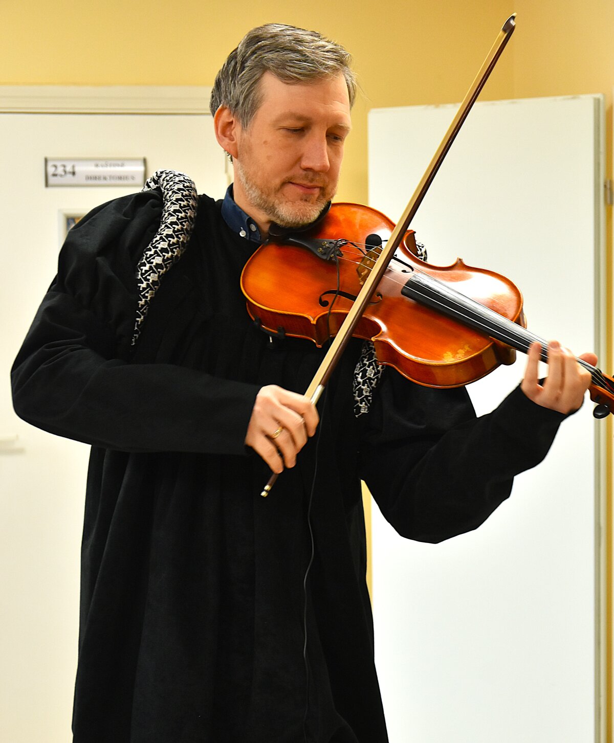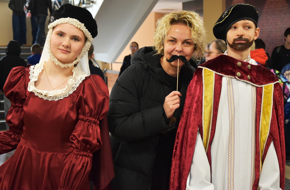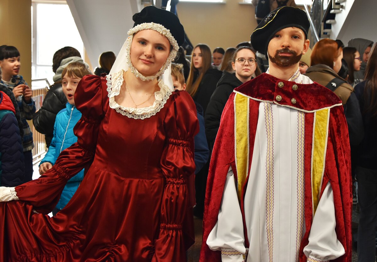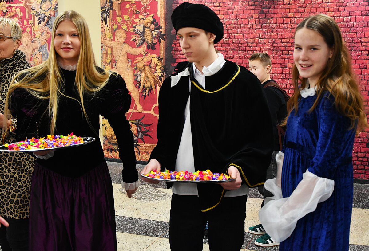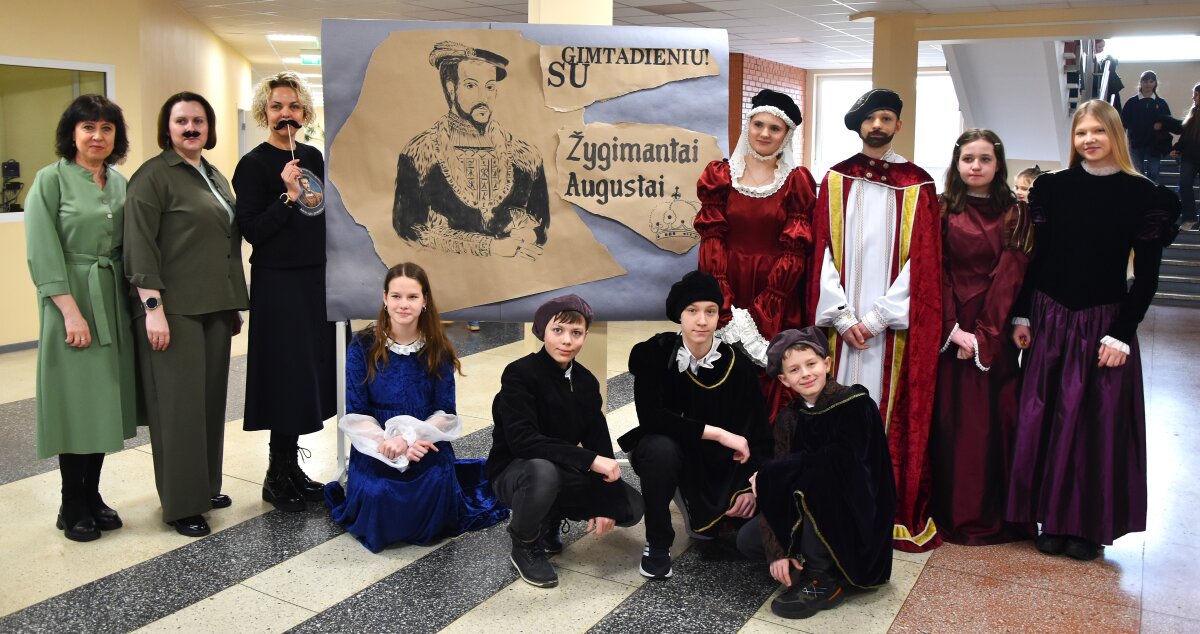Vėliau mokinius progimnazijos fojė pasitiko ypatingi svečiai – Žygimantas Augustas su Barbora Radvilaite ir rūmų patarnautojai, kurie visus vaišino gimtadienio saldainiais bei kūrė šventišką atmosferą.