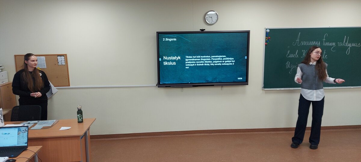Pamokos metu mokiniai susipažino su finansinio raštingumo pagrindais: pajamomis, išlaidomis, taupymo svarba, biudžeto sudarymu ir finansinių tikslų planavimu. Alumnės pateikė realaus gyvenimo pavyzdžių, kurie padėjo suprasti, kaip kasdieniai sprendimai formuoja ilgalaikę finansinę gerovę.