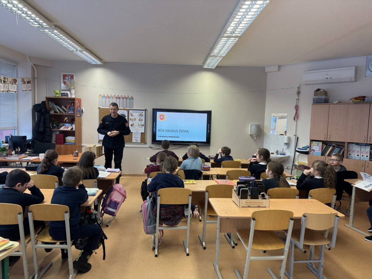 2b klasės mokiniai sulaukė svečio, Trakų rajono savivaldybės priešgaisrinės gelbėjimo įstaigos parengties užtikrinimo specialisto, kuris pravedė pamoką „Būk saugus žiemą“. Pamokos metu mokiniai sužinojo, kaip saugiai elgtis žiemą, kodėl pavojinga lipti ant plono ledo ir kaip apsisaugoti nuo nelaimių šaltuoju metų laiku.